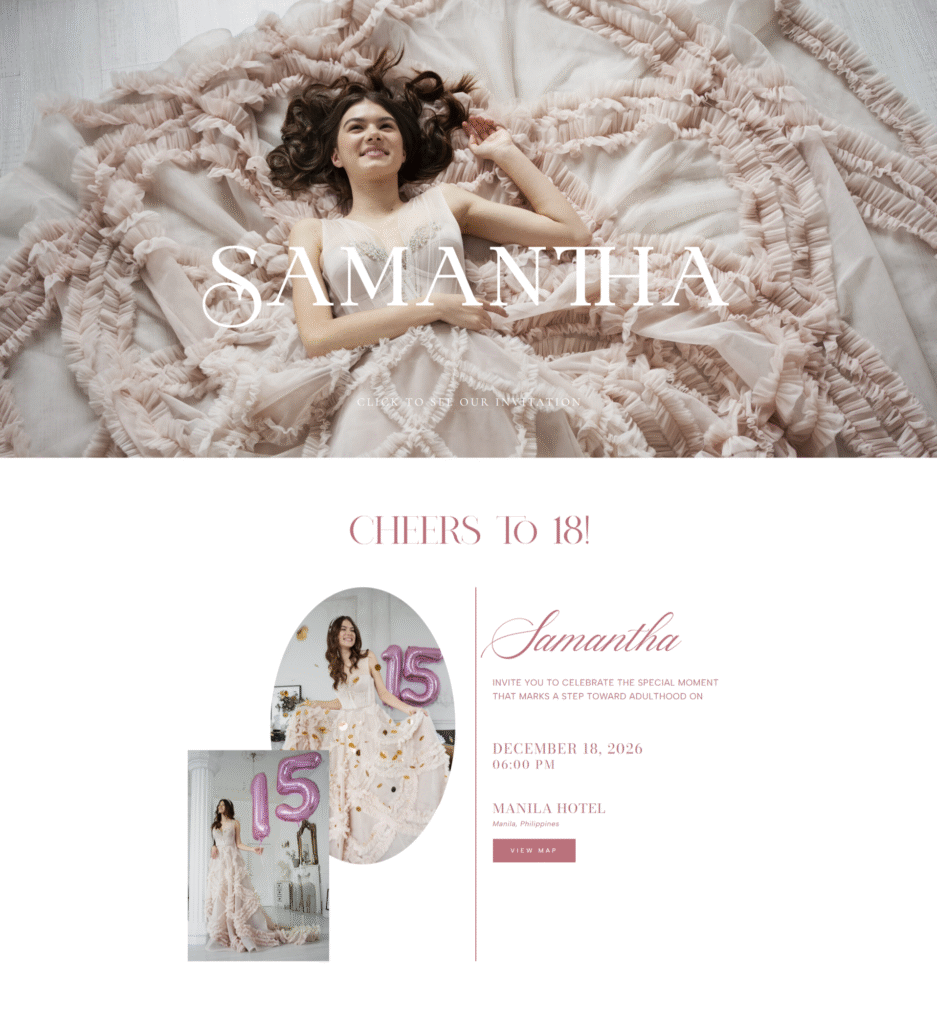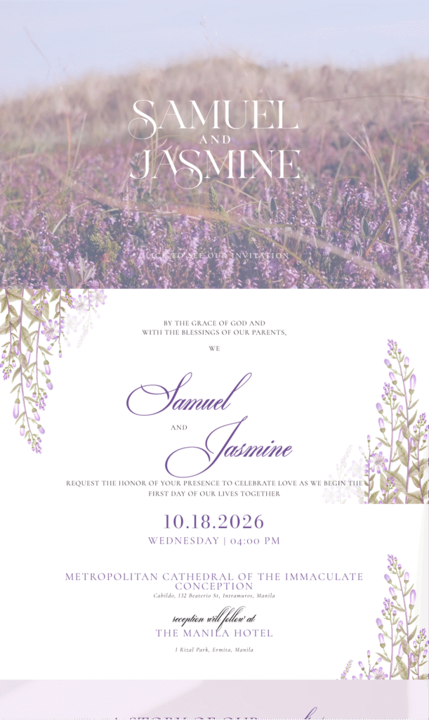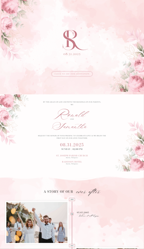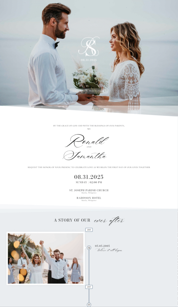 We specialize in custom wedding invitation websites where couples can share their love story, event details, RSVP forms, and more. You can choose from two pre-made templates, which we’ll customize to match your wedding colors, theme, and preferences.